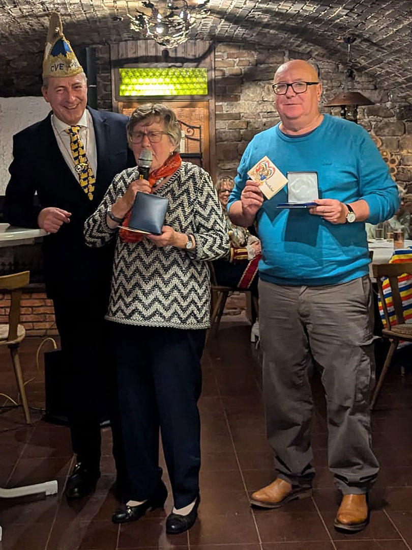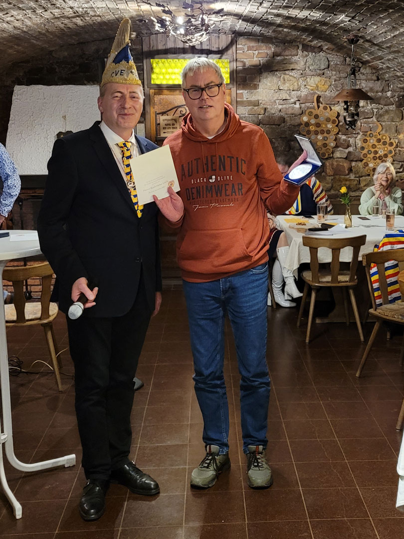 Mit seiner närrischen Generalversammlung starte der CVE am Samstag, den 16.11.2025 in seine Jubiläumskampagne 125 Jahre Entenbrüder, unter dem Motto: „Von Anfang an mit Herz dabei, im bunten Spiel der Narretei.“ Herzlich ging es auch an diesem Abend im Weingut Sans-Lorch zu, als die langjährigen Mitglieder der Entenbrüder mit den Insignien für 11, 22, 25, 33, 44 und 50 Jahre währende, treue Mitgliedschaft ausgezeichnet wurden. Eine Vielzahl an anderen Veranstaltungen machten dem CVE an diesem Tag Konkurrenz. Dennoch waren mehr als 60 Gäste erschienen um sich gut gelaunt auf die Fastnacht beim CVE einzustimmen.