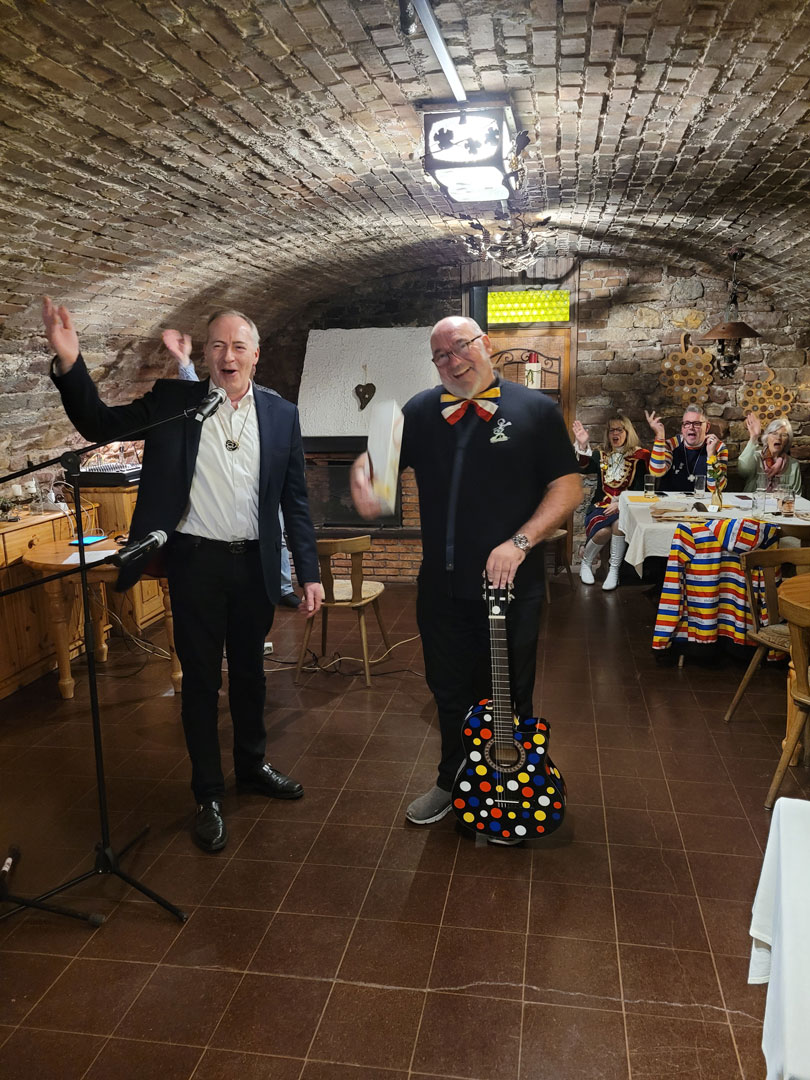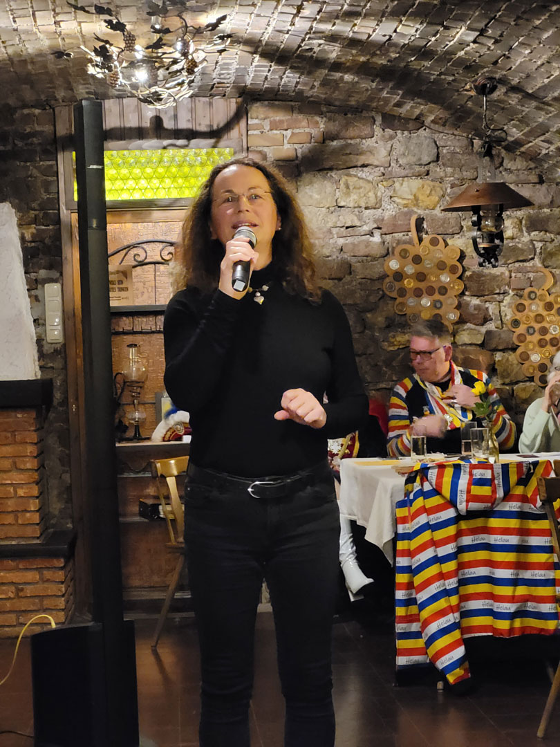 Der 1. Vorsitzende Gerd Zimmermann gab gleich nach seiner Begrüßung einen Ausblick auf die geplanten Veranstaltungen der Kampagne 2025 und holte später nochmals zu einem scharfzüngigen Rundumschlag auf die Politik aus, bei seiner schon traditionellen Einordnung des aktuellen Zeitgeschehens. Darüber hinaus sorgten die Meenzer Zibbelkappe (Sabine Biermann, Rafael Mündnich und Ferdinand Zilla) sowie die CVE-Aktive Birgit Menger für gute Stimmung und animierten die Gäste zum Mitsingen. Zu guter Letzt gab Harry Borgner noch den „alten Holzmichel“ in den verschiedensten Interpretationen bekannter Sänger zum Besten. Für den guten Ton und dezente Fastnachtslieder im Hintergrund sorgte der Mann an der Technik Marcus Boller.