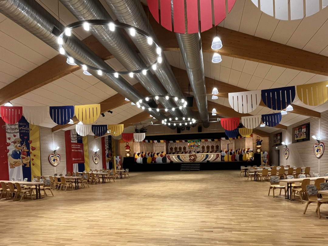 Seit letzen Montag wurde in der Carl-Zuckmayer-Halle in nur vier Arbeitstagen enorm viel geleistet. Dank der vielen Helfer, die oft seit Jahren routiniert den CVE beim Aufbau unterstützen, konnte vermutlich so schnell wie noch nie, die Carl-Zuckmayer-Halle in die Narrhalla der Entenbrüder verwandelt werden. Dabei haben sich die Investitionen der letzten Jahre in den neuen Bühnenaufbau, Verdunklungen, mobile Bühnen- und Thekenelemente, Technik, usw. als richtig und lohnenswert erwiesen und die Arbeit in vielen Bereichen erleichtert. Dennoch ist es immer wieder ein Kraftakt, den es zu stemmen gilt. Deshalb Tausend Dank an alle, die mit ihrem persönlichen Einsatz dazu beitragen, auch 2026 die Voraussetzung für die Entenbrüder-Fastnacht in gewohnt stimmungsvollen Ambiente zu erschaffen! Der CVE wird dabei auch durch die Ortsgemeinde, dessen Bauhof und den Hausmeister dankenswerter Weise bestens unterstützt.