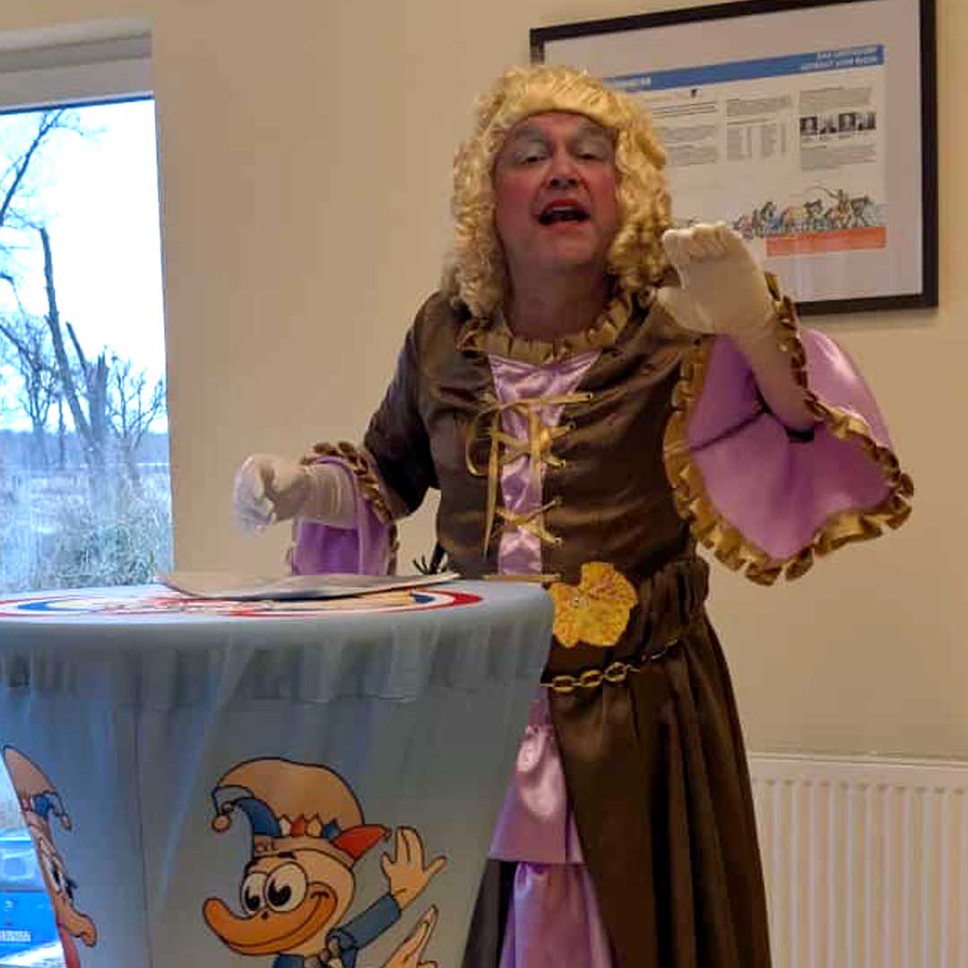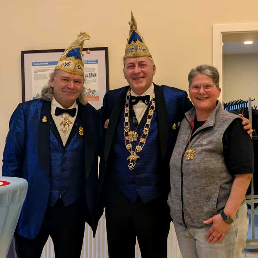 Da aufgrund der sehr kurzen Kampagne die traditionelle Ordensmatinee ausfällt, bekamen die Aktiven ihren neuen Kampagnenorden zu diesem Anlass verliehen. Nach der Begrüßung durch den 1. Vorsitzenden gab Peter Hofmann als Weinkönigin Optima I. sein Debüt als Redner. Das aktive Mitglied der Lörzweiler Hobergschnooge rundete gesanglich seinen Vortrag ab. Derart gut gelaunt eingestimmt, gab es noch einen Ausblick auf die anstehenden Veranstaltungen und deren Organisation. Zugmarschall Ralf Fornoff und Tina Müller gaben Hinweise zu den Umzügen an Fastnacht und baten um Unterstützung bei der Durchführung des Nackenheimer Umzugs am Fastnachtsdienstag. Denn es werden noch Helfer für die Straßenabsperrungen gesucht. Freiwillige können sich gerne melden, unter: cve@entenbrueder.de